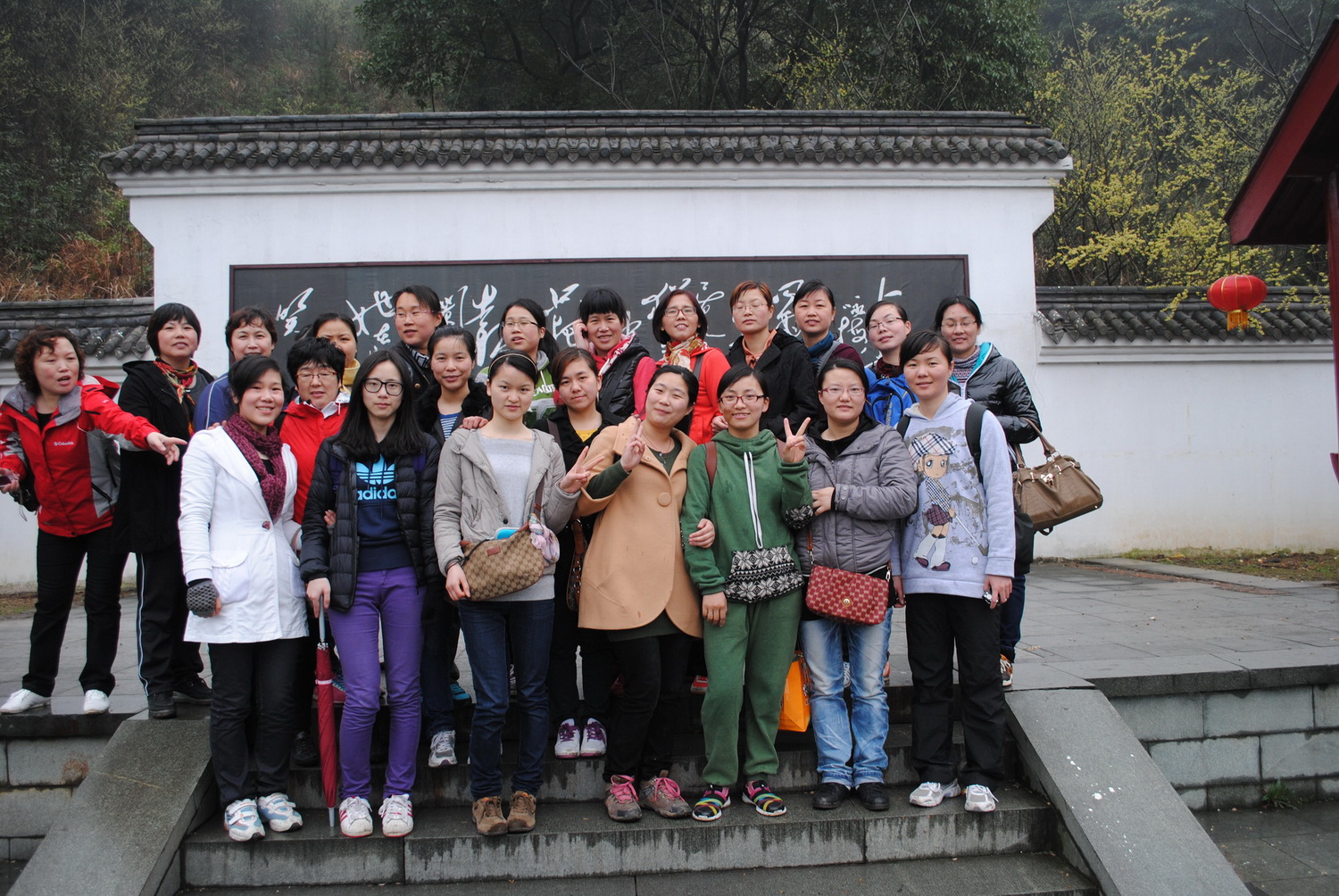 那天,天氣時而陰柔時而細(xì)雨飄零,恰是別有一番韻味,一切都在朦朦朧朧中。女同志們乘著早晨的霧氣直奔九峰之巔,一路上風(fēng)景煞是秀麗,參天大樹,直入云霄,青山綠水,綠意盎然,放眼遠(yuǎn)處群山,如詩如畫。經(jīng)過半個多小時的攀登,終于到達(dá)峰頂,好一句杜甫的“會當(dāng)臨絕頂,一覽眾山小”,山下的房屋、村落、溪流都顯得如此渺小。